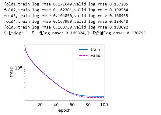 print(f'{k}-折验证:平均训练log rmse:{float(train_l):f},'f'平均验证log rmse:{float(valid_l):f}')