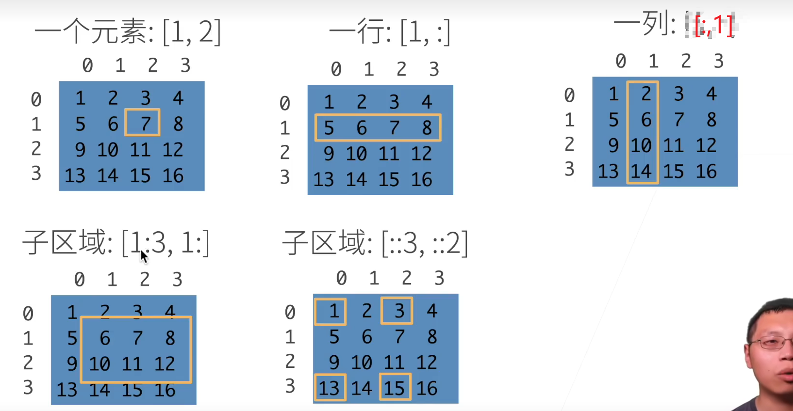 [1,3]:访问二维数组单一元素[2,:]:只有冒号,代表将此维度全部取出[1:3,1:]:冒号前后跟数字代表取一个_前闭后开_区间的元素,多在 CNN 中用于在整张图片矩阵中取出一个子区域的数据操作来与卷积核进行运算[::3,::2]:两个冒号后代表隔几个元素取,多用于 CNN 中的“空洞卷积”操作