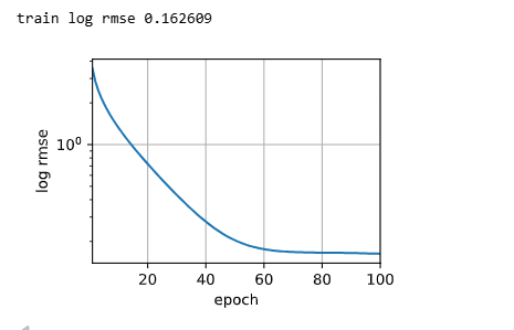 def train_and_pred(train_features, test_feature, train_labels, test_data, num_epochs, lr, weight_decay, batch_size):net = get_net()train_ls, _ = train(net, train_features, train_labels, None, None, num_epochs, lr, weight_decay, batch_size) d2l.plot(np.arange(1, num_epochs + 1), [train_ls], xlabel='epoch',ylabel = 'log rmse', xlim=[1,num_epochs], yscale='log')print(f'train log rmse {float(train_ls[-1]):f}')preds = net(test_features).detach().numpy()test_data['SalePrice'] = pd.Series(preds.reshape(1,-1)[0])submission = pd.concat([test_data['Id'],test_data['SalePrice']],axis=1)submission.to_csv('submission.csv',index = False)train_and_pred(train_features, test_features, train_labels, test_data,num_epochs, lr, weight_decay, batch_size)
