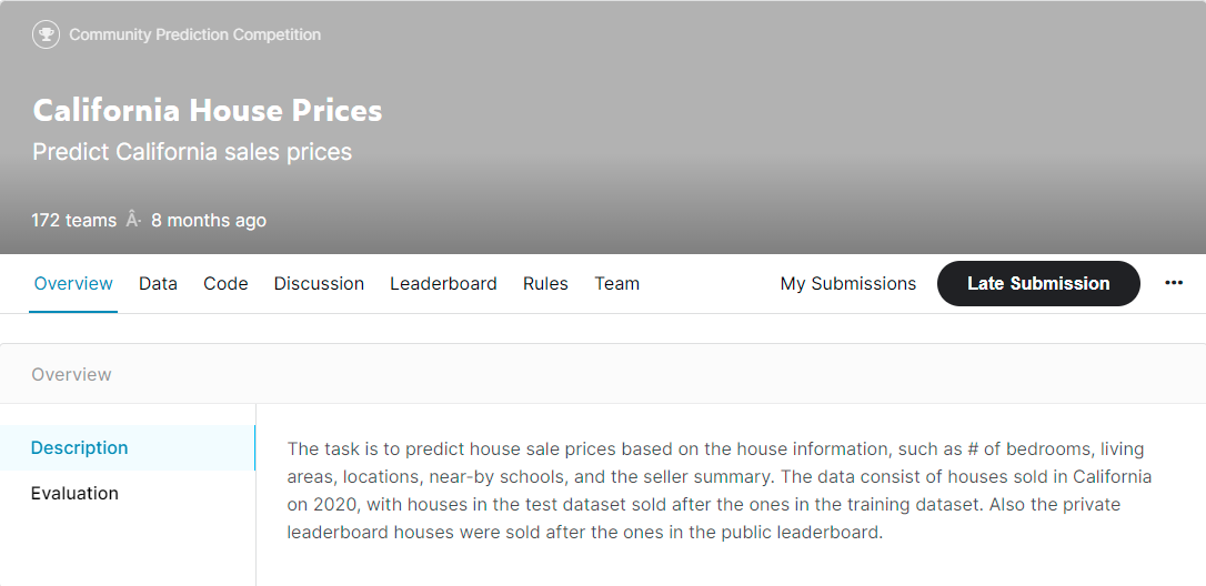 本节课最后,李沐老师动员大家去 Kaggle 上做他为课程专门开设的一个小竞赛California House Prices,作为前期学习效果的实践巩固和检验。大家可以点击下图访问查看 👇。目前仍然可以提交成绩,整个数据集大小在 80Mb 左右,涉及 40 个特征,训练数据共 47439 条,测试数据共 31626 条。