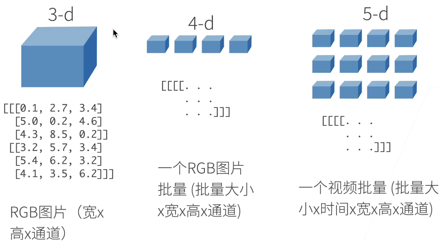 - N=3:一般用于表示一张彩色图像(宽 X 高 X 通道);或黑白图像数据集(批量大小 X 宽 X 高)