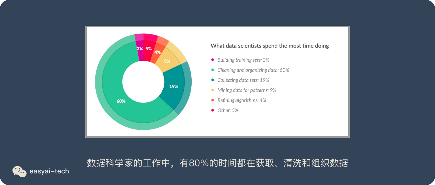 在 16 年的一项调查中发现,数据科学家的工作中,有 80%的时间都在获取、清洗和组织数据。构造机器学习流水线的时间不到 20%。详情如下: