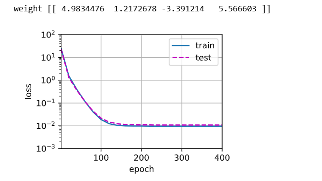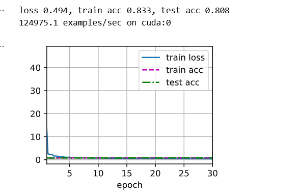 trainer = torch.optim.SGD(net.parameters(), lr=lr) #net.parameters(recurse=True)返回模块和所有子模块的参数。d2l.train_ch3(net, train_iter, test_iter, loss, num_epochs, trainer)