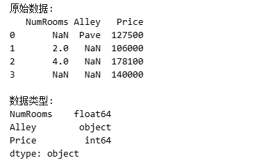 pd.read_csv(file):读取 CSV 文件并转换为 Pandas Dataframe 格式[Dataframe].iloc[:,0:2]:取出对应索引的数据分片[Dataframe].fillna(value):补充缺失数据pd.get_dummies([Dataframe, dummy_na=True]):将离散类别进行 One-hot 编码成数字,同时将缺失值当成一种类别