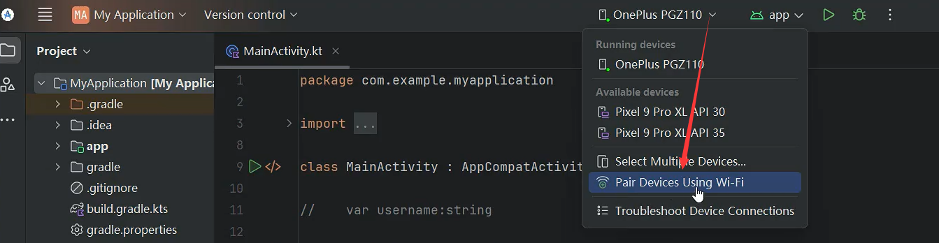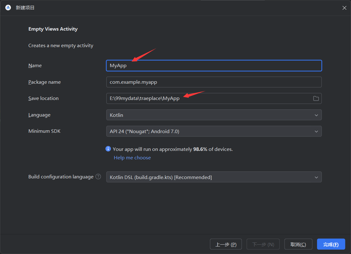 配置项 内容与作用 Name 项目名称(此处为 “MyApp”),用于标识项目,可根据需求自定义。 Package name 包名(此处为 “com.example.myapp”),遵循反向域名格式,是应用的唯一标识符,需确保在应用分发平台的唯一性。 Save location 项目存储路径(此处为 “E:\99mydata\traeplace\MyApp”),指定项目在本地磁盘的存储位置,可点击文件夹图标修改。 Language 开发语言(此处为 Kotlin),Kotlin 是 Android 官方推荐的开发语言,相比 Java 具备更简洁的语法和空安全等特性。 Minimum SDK 最低 SDK 版本(此处为 API 24,对应 Android 7.0 “Nougat”),决定应用兼容的设备范围,该版本可覆盖约 98.6% 的设备,选择时需平衡兼容性与新特性支持。 Build configuration language 构建配置语言(推荐 Kotlin DSL,即 build.gradle.kts),相比传统 Groovy DSL,Kotlin DSL 具备类型安全、语法简洁的优势,是现代 Android 构建配置的推荐方式。