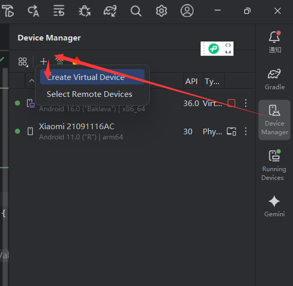点击“finish”,会下载相关程序,在设备列表就可以看到,并进行运行管理,当运行后,在窗口顶部就可以选到可用的模拟器。