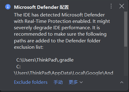 点击 “Exclude folders” 可快速将上述路径添加到排除列表;若需手动配置,可进入 Microsoft Defender 的 “病毒和威胁防护设置”,在 “排除项” 中添加对应文件夹。添加排除后,IDE 性能会得到明显提升。