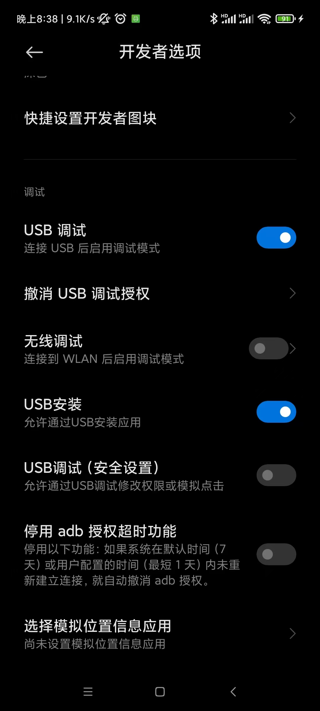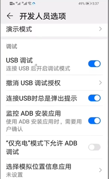 USB 调试 :这是最重要的设置,允许 Android Studio 通过 USB 与设备通信,安装和调试应用。