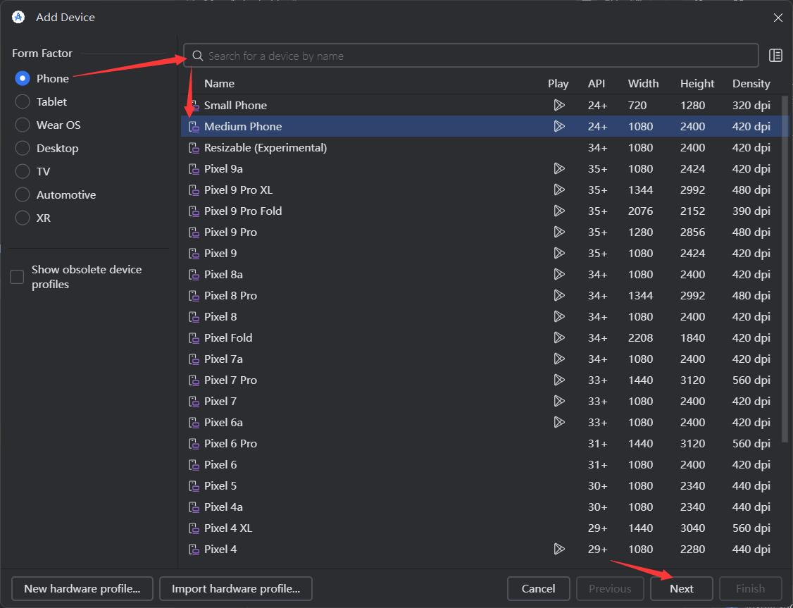 | 设备名称(Name) | 此处为 “Medium Phone”,可自定义命名以区分不同虚拟设备。 |