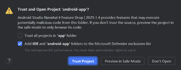为防范潜在恶意代码执行,Android Studio 对项目打开设置了安全确认机制,尤其针对来源不明的项目,提醒开发者评估风险,类似下面提示信息:
