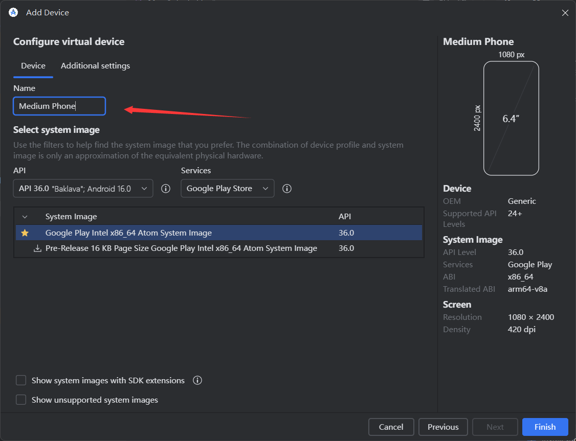 | 系统镜像(System Image) | 选择 “Google Play Intel x86_64 Atom System Image”,API 级别 36.0(对应 Android 16.0 “Baklava”),支持 Google Play 服务,可模拟带应用商店的真实设备环境。 |