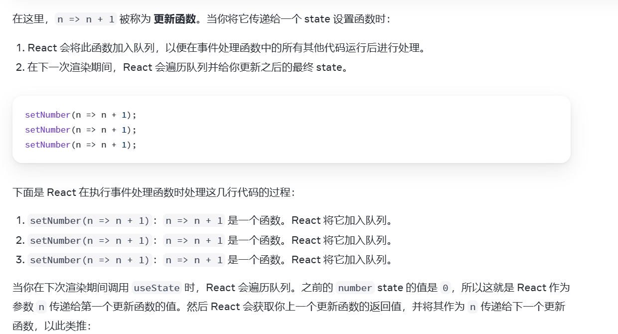 setState,React 都会等到这个函数完全执行完毕后,再统一处理所有的状态更新,然后触发一次渲染。这样可以避免频繁渲染导致的性能问题,也能防止出现 “部分状态更新的半成品 UI”。比如在一个点击事件中连续三次调用setNumber(1)、setNumber(2)、setNumber(3),React 会在事件函数执行完后,直接将number更新为 3,然后触发一次渲染。“要在一个事件中多次更新某些 state,你可以使用 setNumber (n => n + 1) 更新函数”当需要在一次事件中基于前一次的状态结果进行多次更新时(如连续累加),直接传值的方式(如