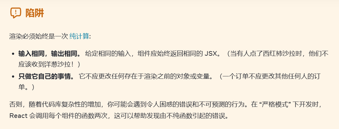 React 的 “严格模式(StrictMode)” 会主动调用组件函数两次,以此暴露不纯的渲染逻辑 —— 如果组件在两次调用中输出不同,或产生了副作用(如修改外部变量),开发者就能快速识别出问题,从而修复以保证渲染的纯计算特性。