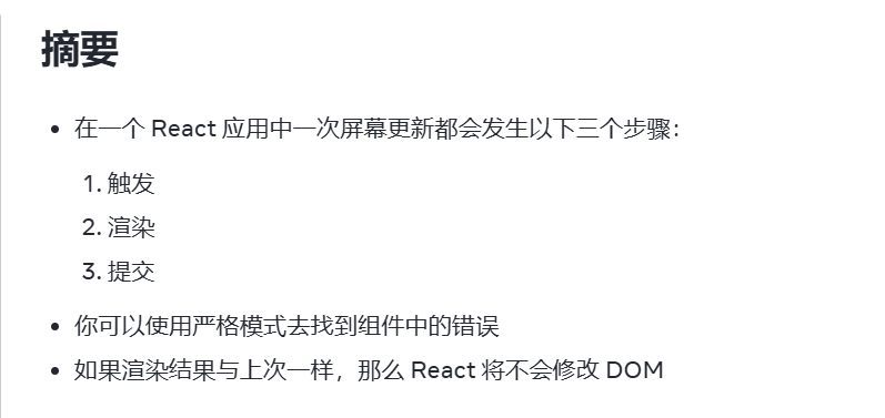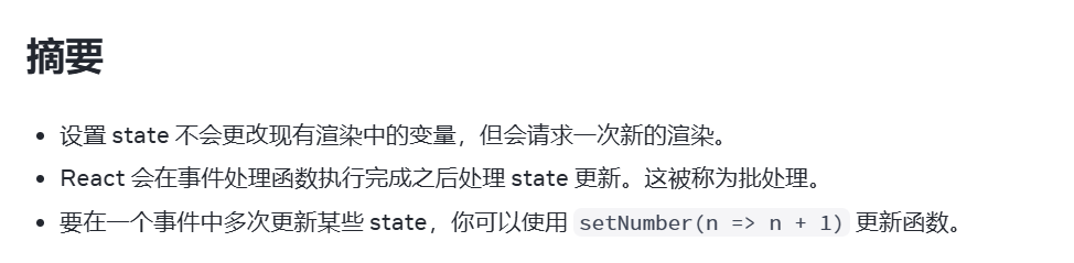- 只有在事件处理函数(如点击、输入)执行完毕后,React 才会批量更新 UI。也就是说,在事件处理函数内部多次更新状态,不会立即反映到界面上。