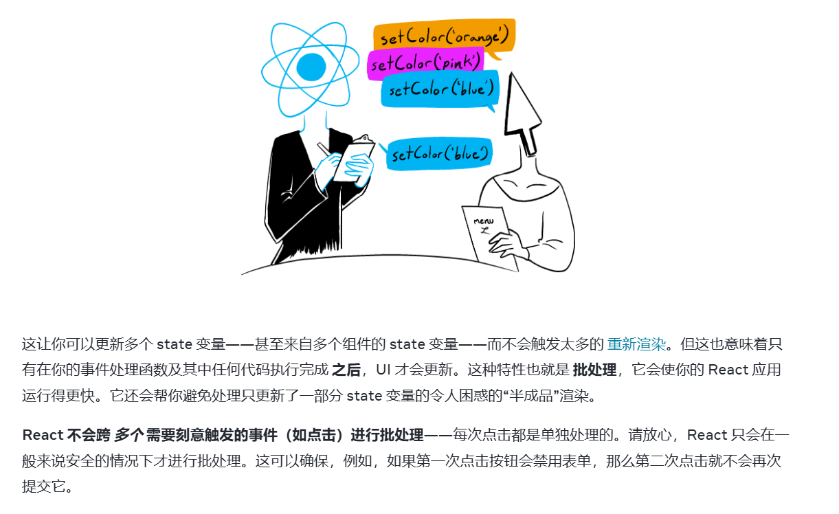 setState(或useState的更新函数)调用合并为一次重新渲染。比如图中多次调用setColor(setOrange、setPink、setBlue),最终只会触发一次 UI 更新。 - 这样做的好处是减少不必要的渲染次数,让应用运行更快,同时避免出现 “只更新了部分状态的半成品 UI”。