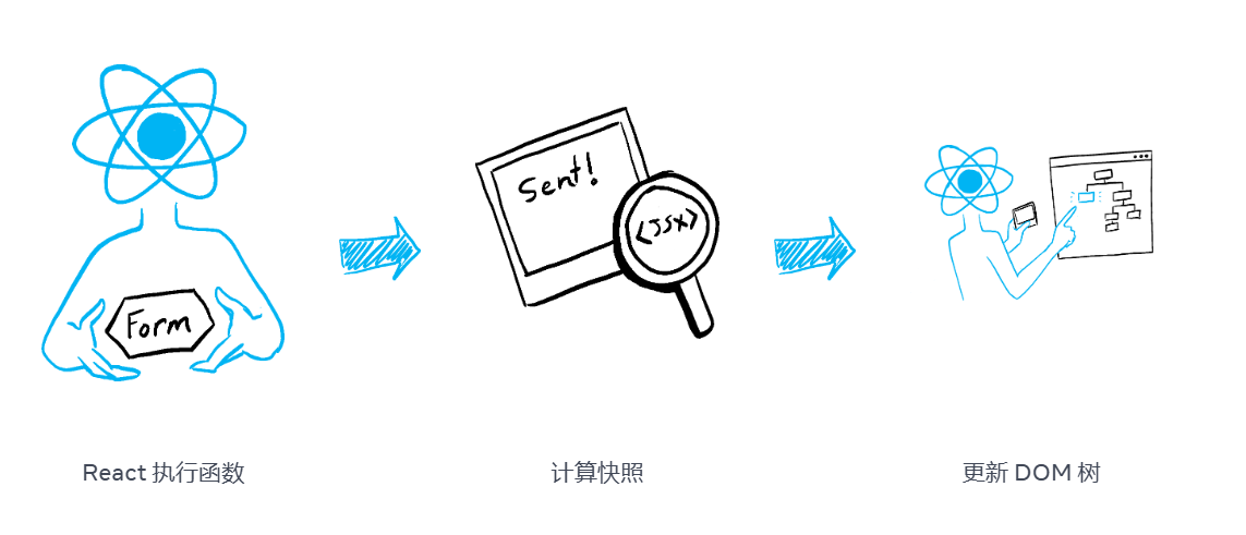 - 首先,React 执行组件函数(图中以持有 “Form” 的 React 标识人物体现)。