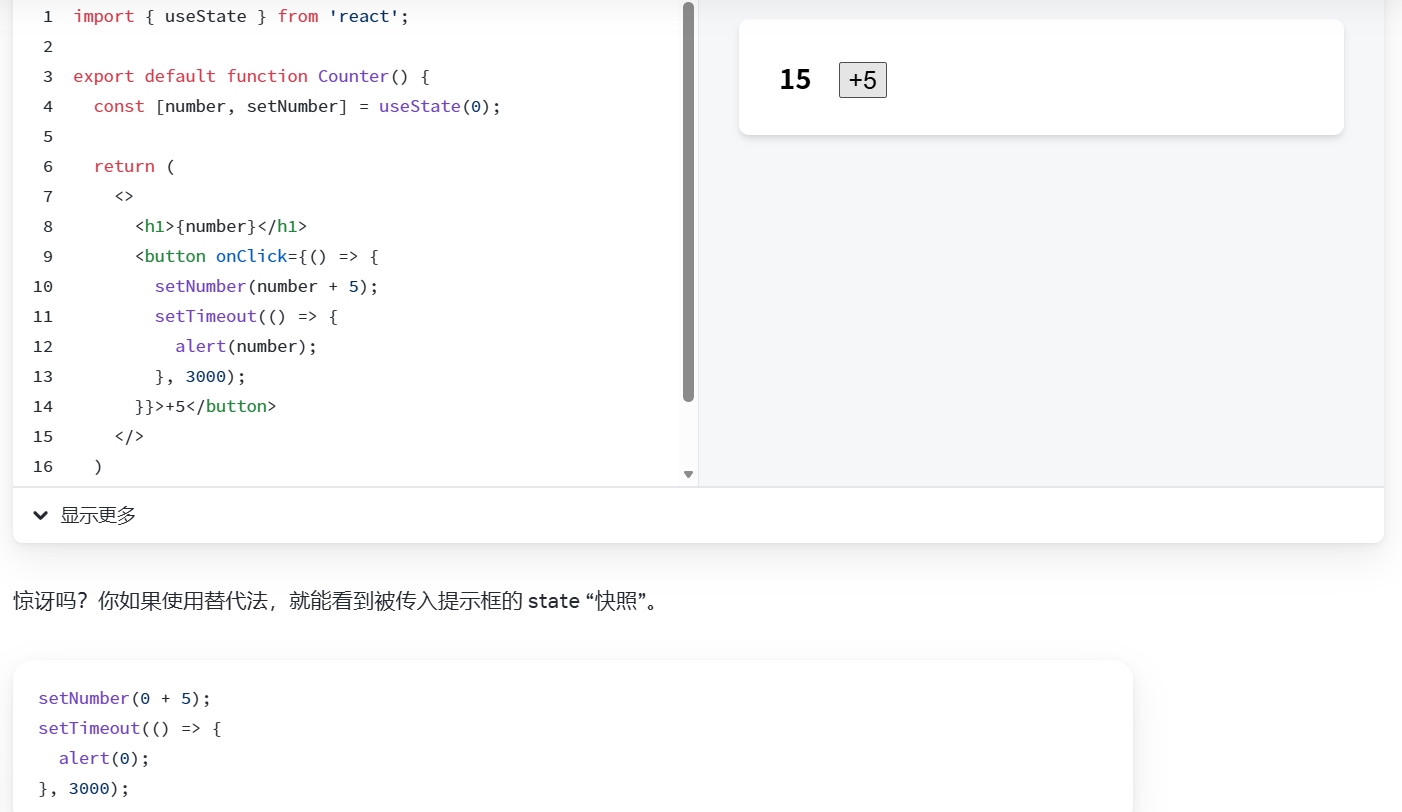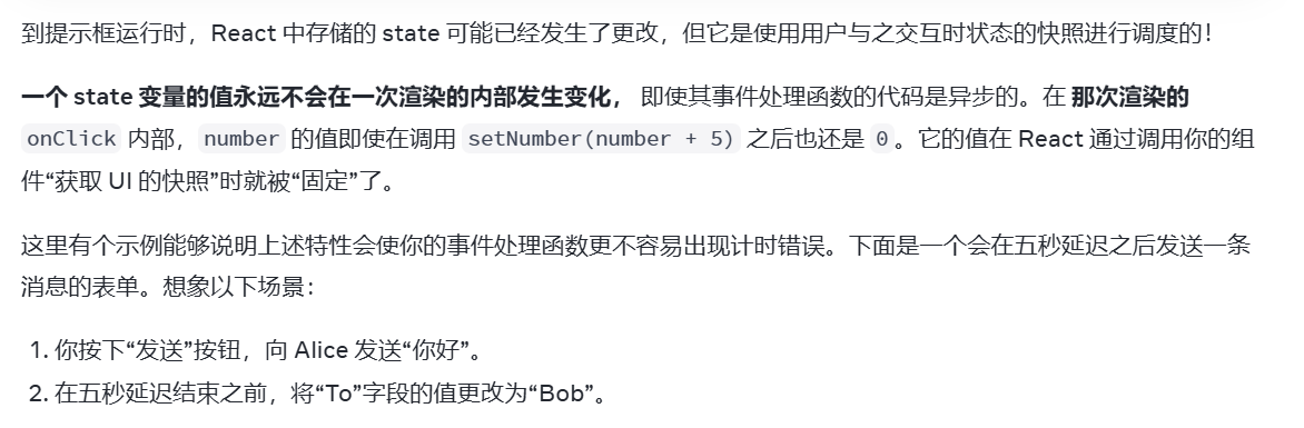 这是一个关于 React 状态 “快照” 特性的代码示例,可分点解读如下: