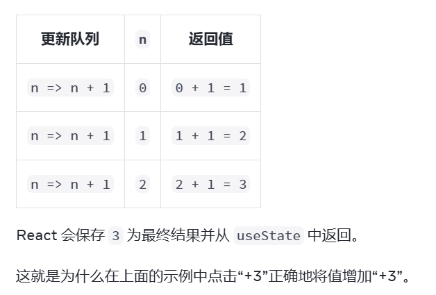 此时,React 的更新队列会记录这三个函数,形成一个队列:[n => n+1, n => n+1, n => n+1]。