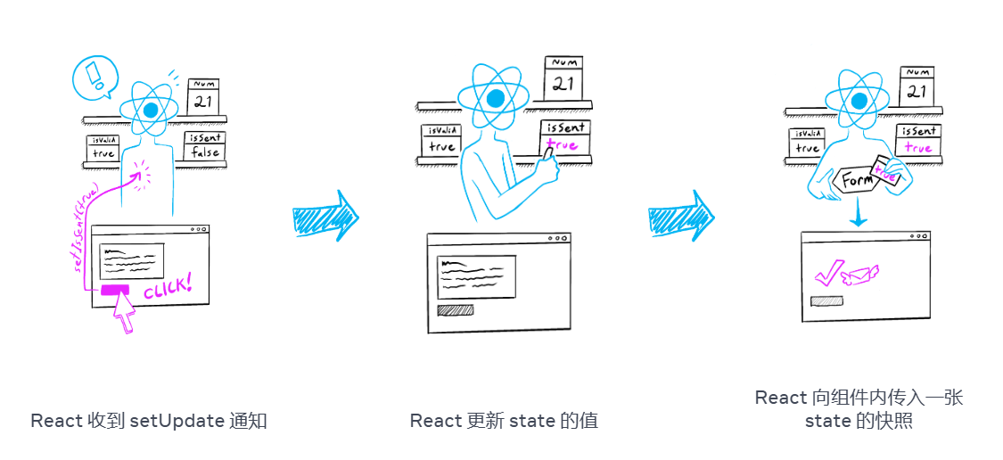 setUpdate),React 收到通知。 - 随后,React 更新 state 的值(图中 “isSent” 从 false 变为 true 的状态变更)。