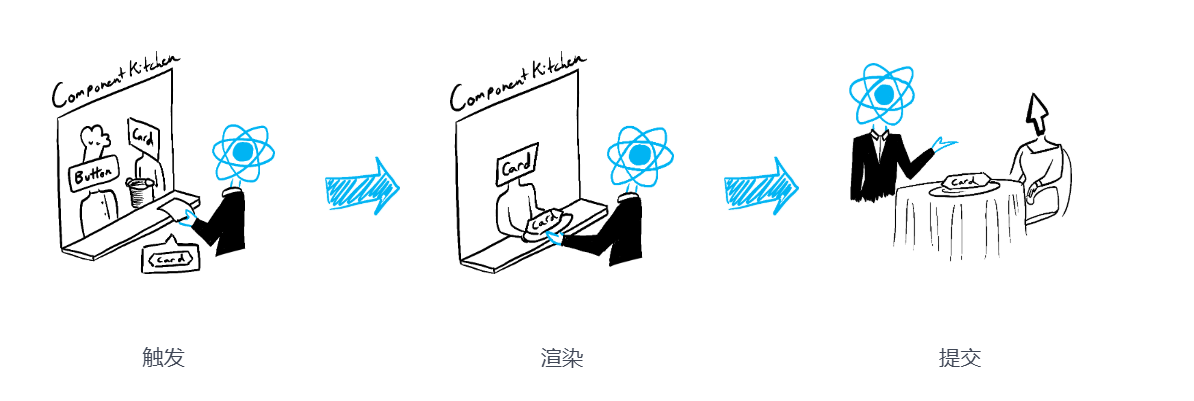 - 提交阶段:带有 React 标志的角色将 “Card” 组件呈现给用户(箭头标识的角色)。