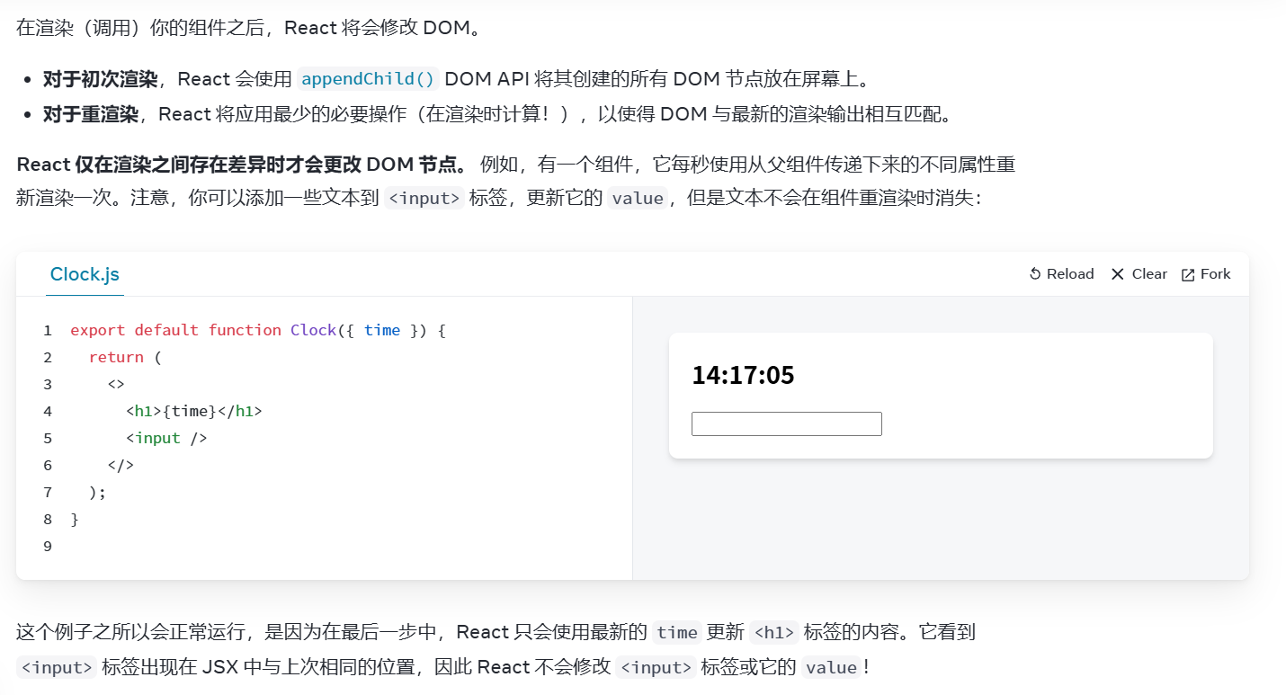 appendChild()这个 DOM 工具,把所有新创建的 DOM 节点(比如页面上的按钮、文字框)添加到页面上,就像把新做的菜端到餐桌上。 - 重渲染(页面更新):React 会只做必要的修改,让 DOM 和最新的渲染结果匹配。比如页面上只有时间变了,就只更新时间部分,其他不变,这样能提高效率。