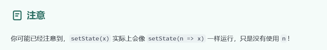 setState(x)(或useState的状态设置函数直接传值,如setNumber(5))时,其执行逻辑等价于setState(n => x)(或setNumber(n => 5)),只是没有使用参数n(即不依赖之前的状态值)。 - 这说明直接传值的状态更新本质上也是一种函数式更新的简化形式,进一步体现了 React 状态更新的一致性机制。