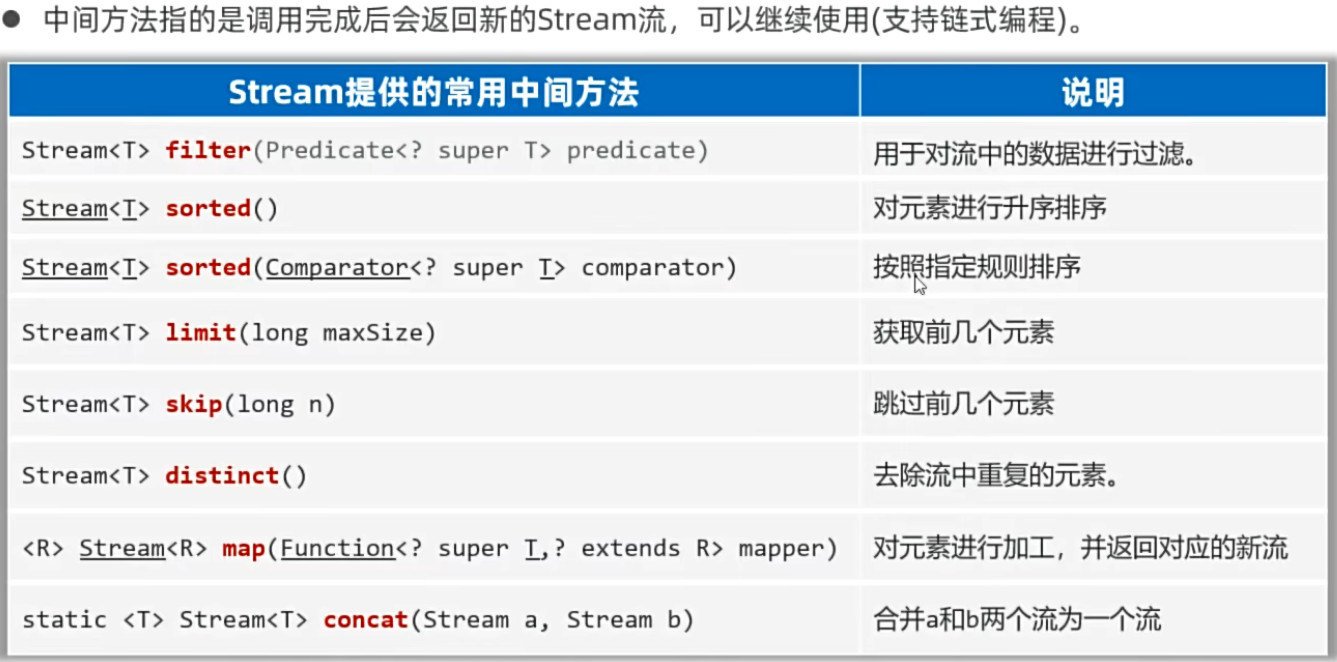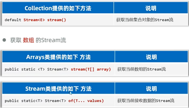 import java.util.stream.Stream;public class StreamDemo2 {public static void main(String[] args) { //获取stream流//1、获取集合的stream流Collection<String> list = new ArrayList<>();Stream<String> streamList =list.stream(); //获取集合的stream流//2、获取Map集合的stream流Map<String, String> map = new HashMap<>();//map.stream(); //报错//获得Map集合键的stream流Stream<String> keyStream= map.keySet().stream();//获取Map值的stream流Stream<String > valuesStream = map.values().stream();//获取键值对的stream流Stream<Map.Entry<String, String>> EntryStream = map.entrySet().stream();//3、获取数数组的stream流String[] arr = {"张三", "李四", "王五"};//方法1、Stream<String> streamArr = Arrays.stream(arr); ////方法2、Stream<String> streamArr2 = Stream.of(arr);Stream<String> streamArr3 = Stream.of("张三", "李四", "王五"); //这里可以传入多个参数}