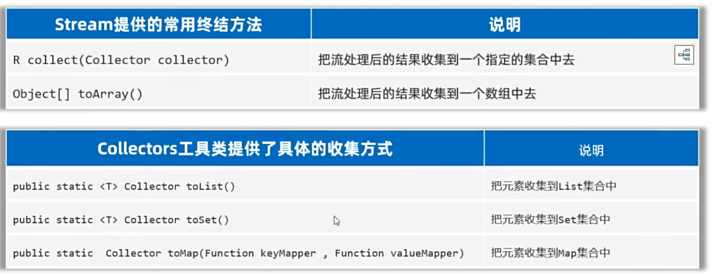 - 收集Stream流:就是把Stream流操作后的结果传回到集合或者数组去返回。