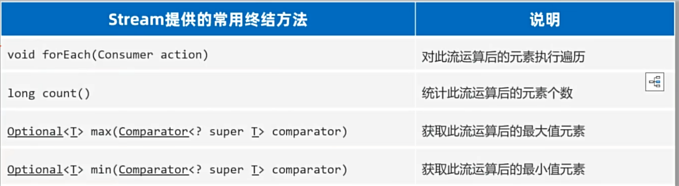 - 终结方法指的是调用完成后,不会返回新的Stream流了,没法继续使流了。
