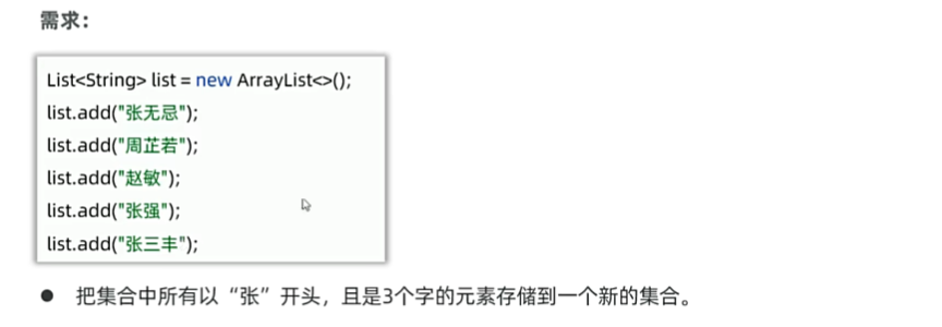import java.util.stream.Collectors;public class Demo3Stream {public static void main(String[] args) {//目标:认识stream 流,掌握stream 的基本使用,体会它的好处List<String> list = new ArrayList<>(); //创建数组列表list.add("张三");list.add("张三丰");list.add("熊大");list.add("赵敏");list.add("张无忌");list.add("张翠山");list.add("光头强");list.add("小龙女");//1、现在要将所有以张开头且3字符的元素,存储到一个新集合//方式1、使用传统方案//startsWith 判断字符串开头前缀List<String> list2 = new ArrayList<>();for (String s : list) {if(s.startsWith("张") && s.length() == 3){list2.add(s);}}System.out.println(list2);//方式2、使用 stream流System.out.println(list.stream().filter(s -> s.startsWith("张")).filter(s -> s.length() == 3).collect(Collectors.toList()));}