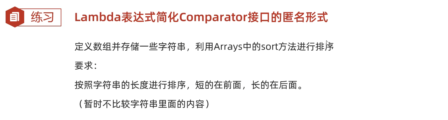 import java.util.Comparator;public class Lambda_test3 {public static void main(String[] args) {String []arr={"aaa","a","aa","aaaa"};Arrays.sort(arr, (o1, o2)->o1.length()-o2.length());System.out.println(Arrays.toString(arr));}