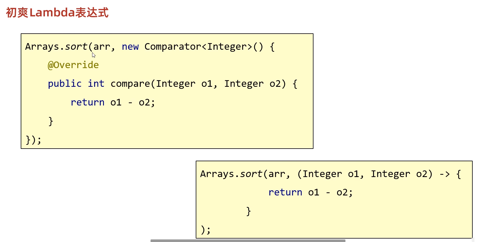 import java.util.Comparator;public class Lambda_test2 {public static void main(String[] args) {Integer []arr={4,5,8,3,2,7,1};Arrays.sort(arr, ( o1, o2)->o1-o2);System.out.println(Arrays.toString(arr));}