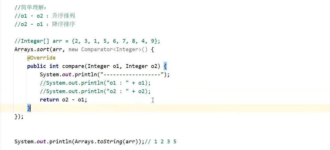 import java.util.Comparator;public class sort_test {public static void main(String[] args) {Integer[]arr={1,8,7,2,54,96,20};Arrays.sort(arr, new Comparator<Integer>() {@Overridepublic int compare(Integer o1, Integer o2) {return o1-o2;//正序 o2-o1是降序}});System.out.println(Arrays.toString(arr));}