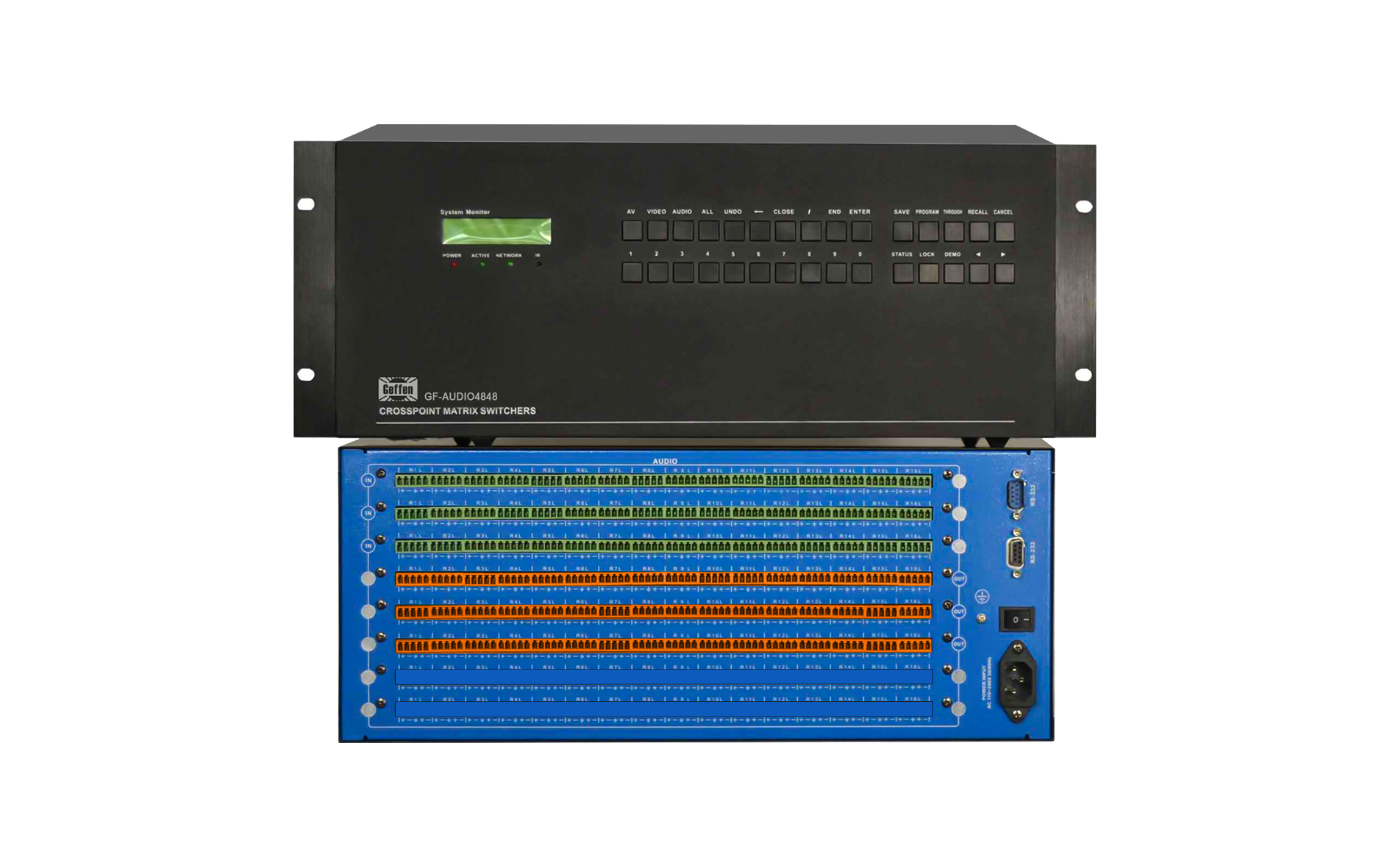 相较于中小型音频矩阵,格芬科技GEFFEN是音频矩阵的源头厂家,认证齐全,支持OEM ODM 48 进 48 出纯音频矩阵在通道容量、处理能力、稳定性等方面具备显著优势,能够完美适配大型复杂场景的音频管控需求。