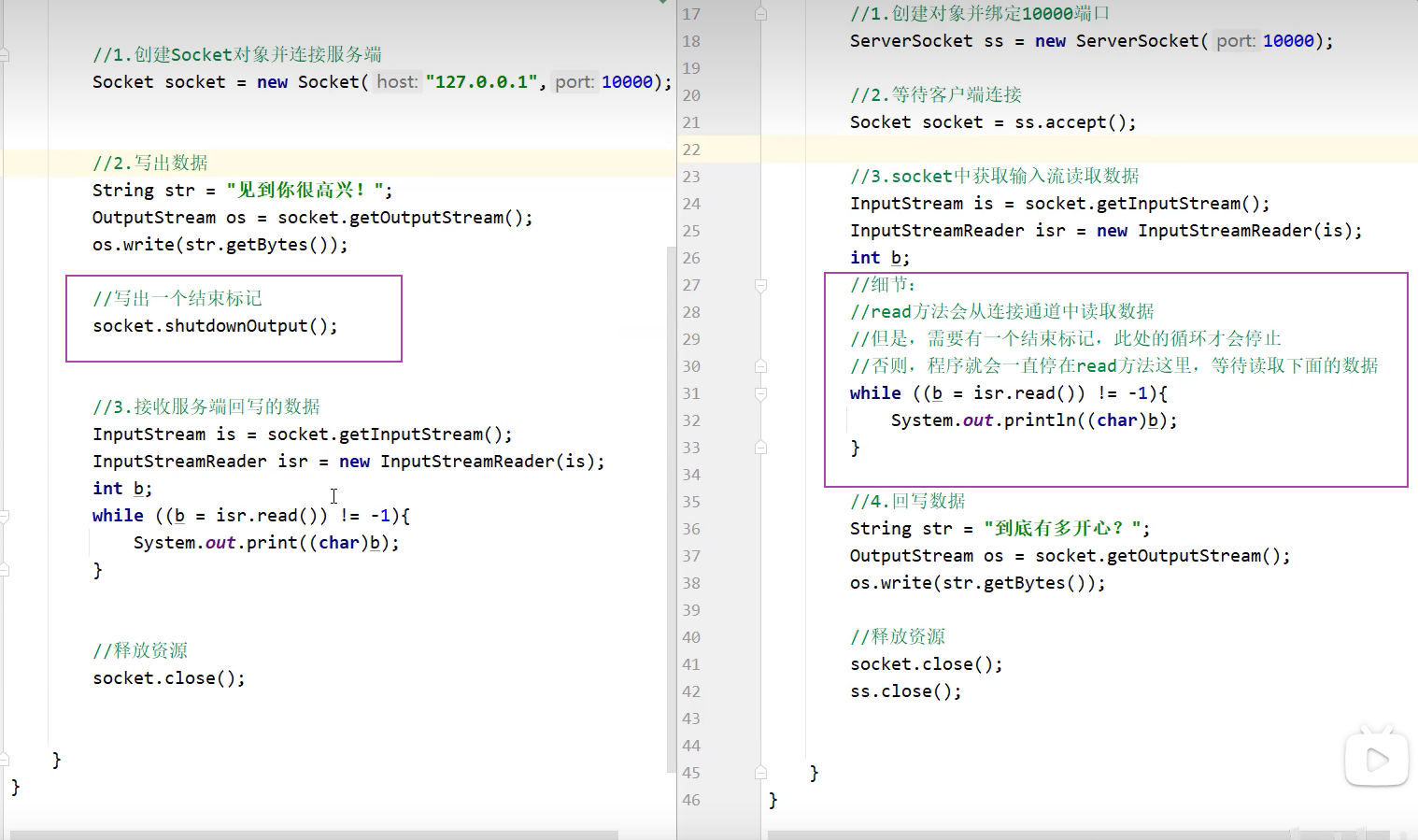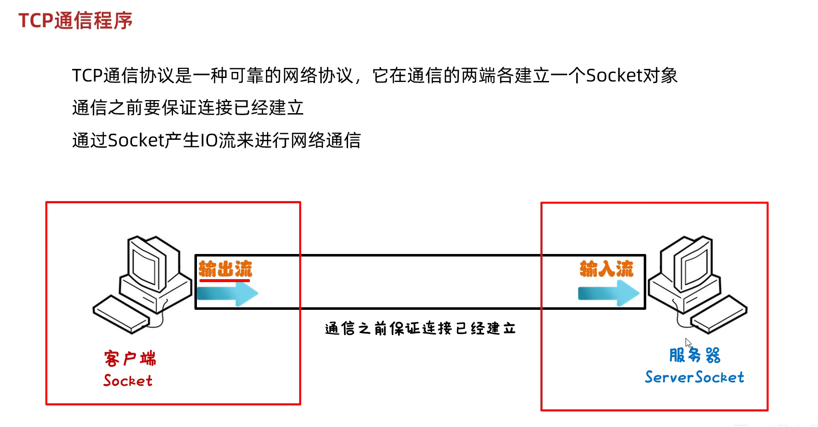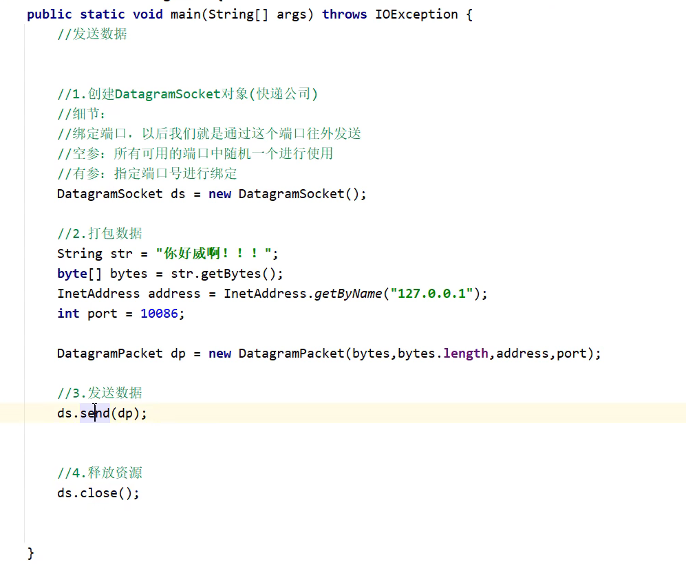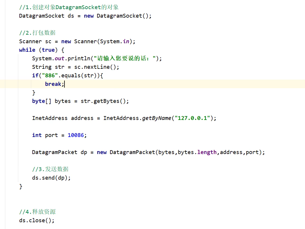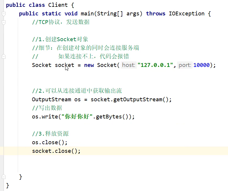 // 发送端public static void main(String[] args) throws IOException {Socket socket = new Socket("127.0.0.1",65535);BufferedWriter bos = new BufferedWriter(new OutputStreamWriter(socket.getOutputStream()));bos.write("你好你好,Java");bos.close();socket.close();}