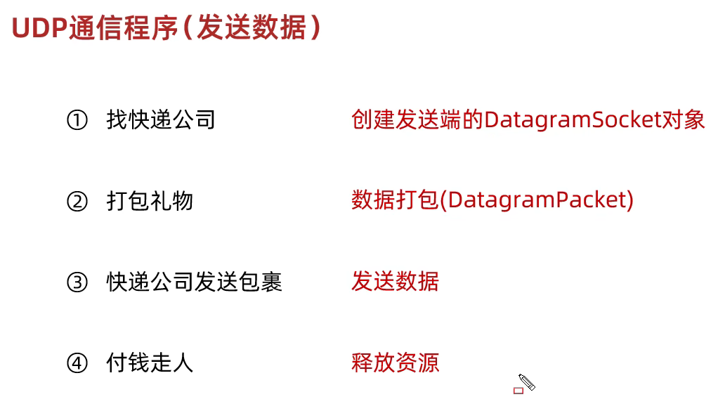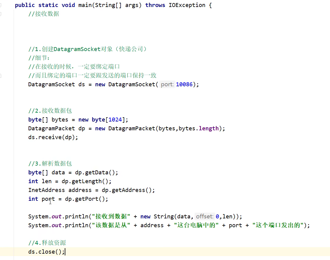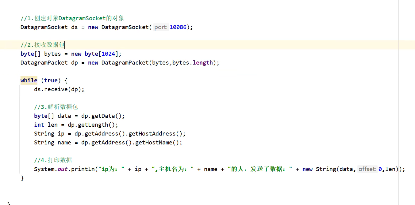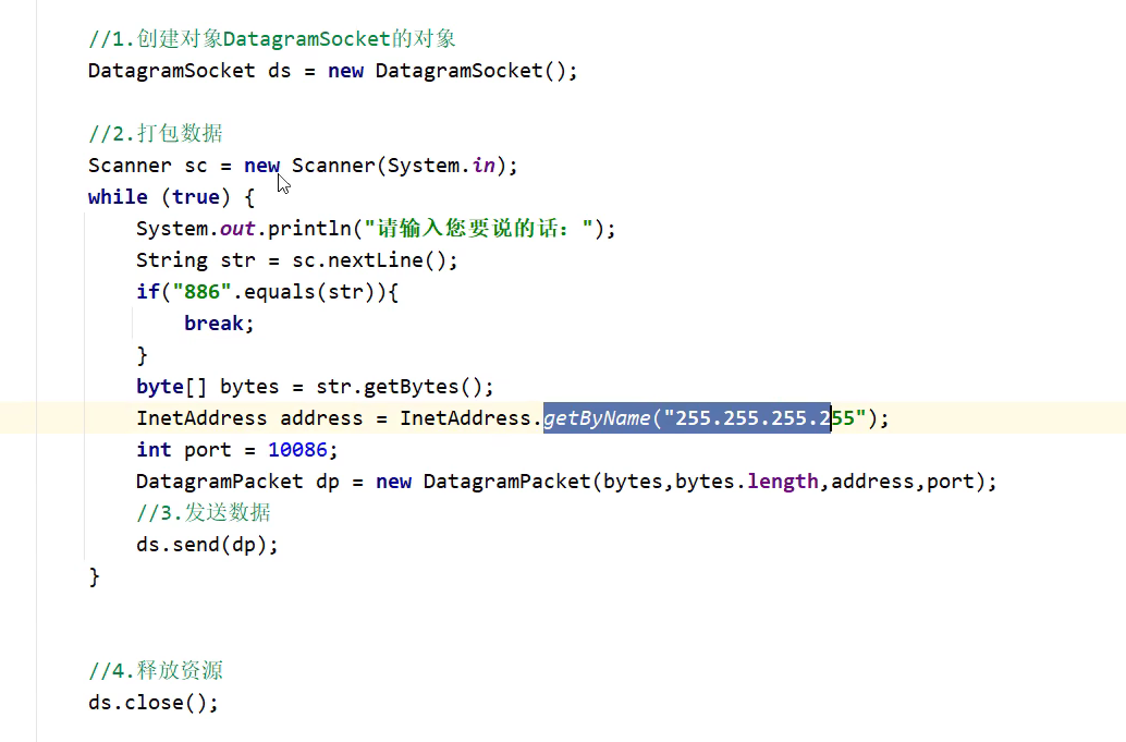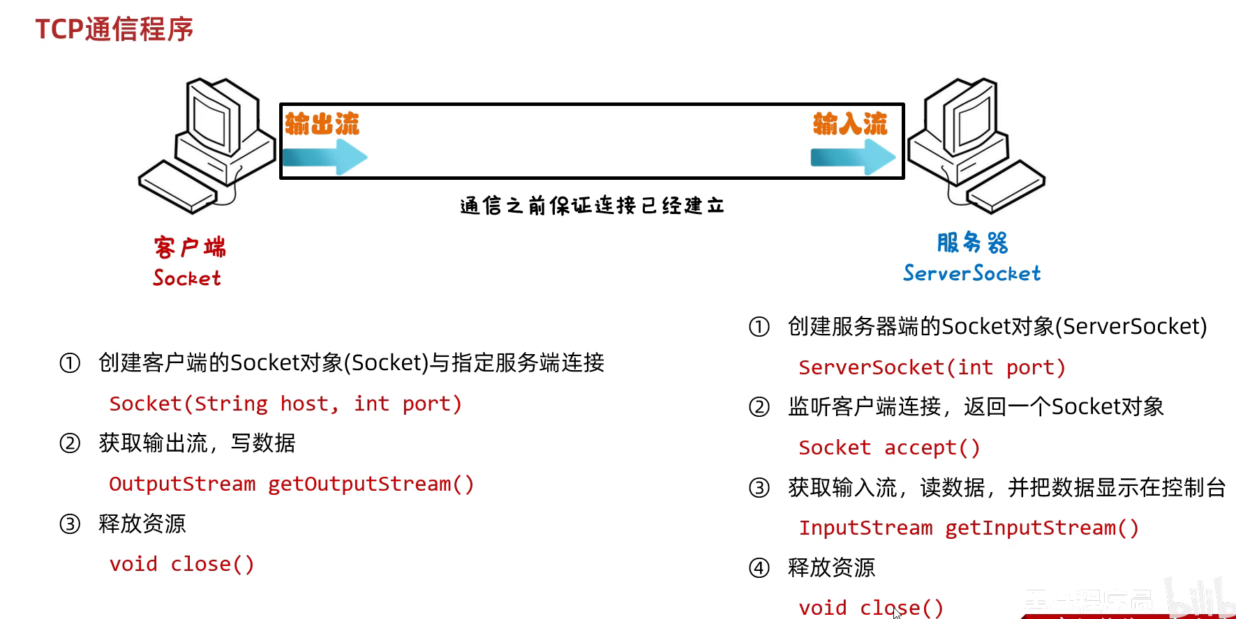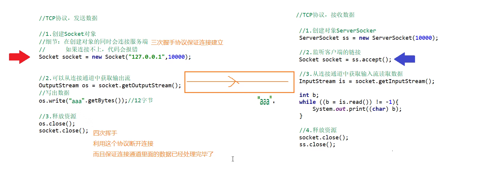 // 发送端public static void main(String[] args) throws IOException {Socket socket = new Socket("127.0.0.1",65535);BufferedWriter bos = new BufferedWriter(new OutputStreamWriter(socket.getOutputStream()));bos.write("你好你好,Java");bos.close();socket.close();}