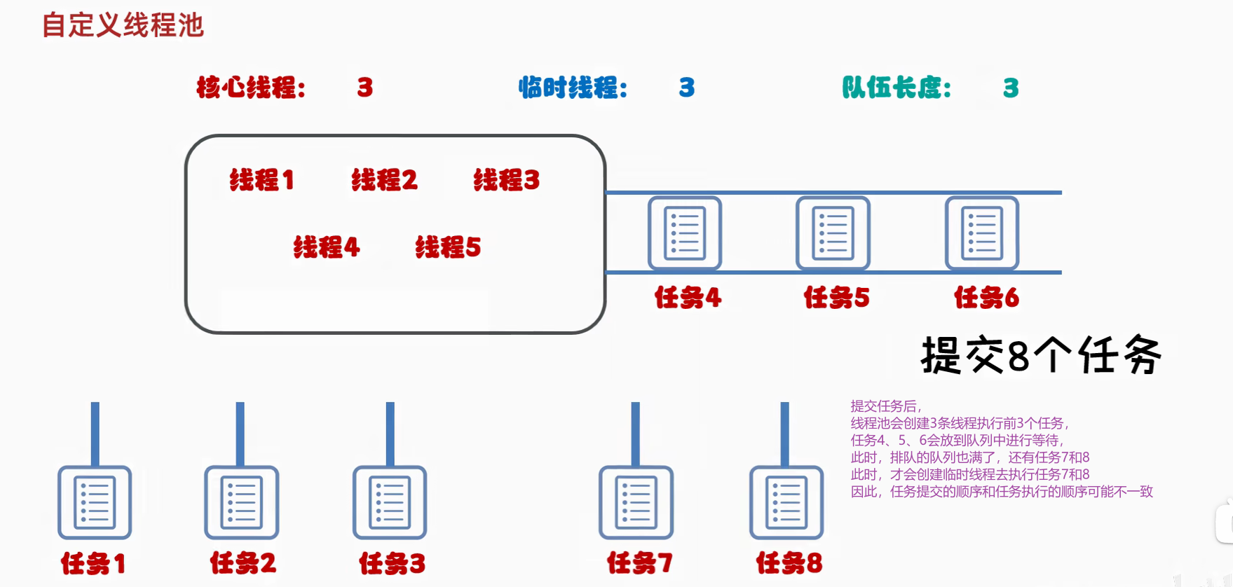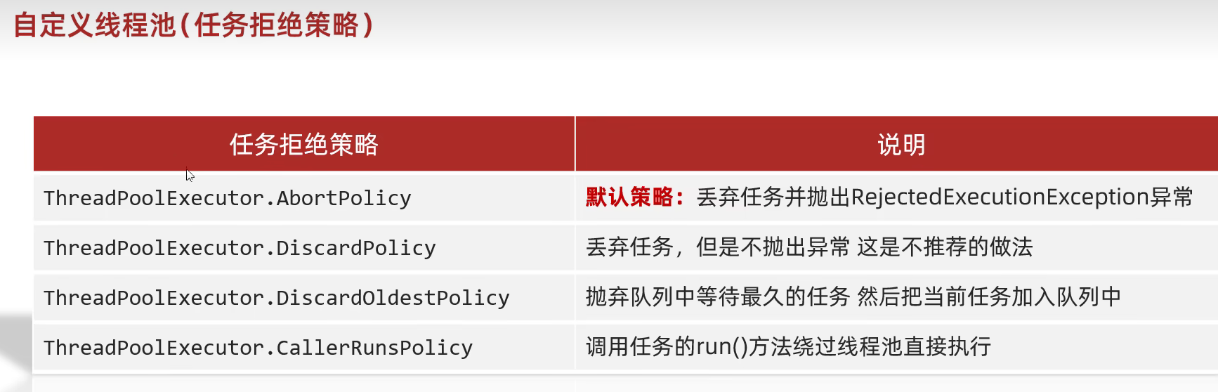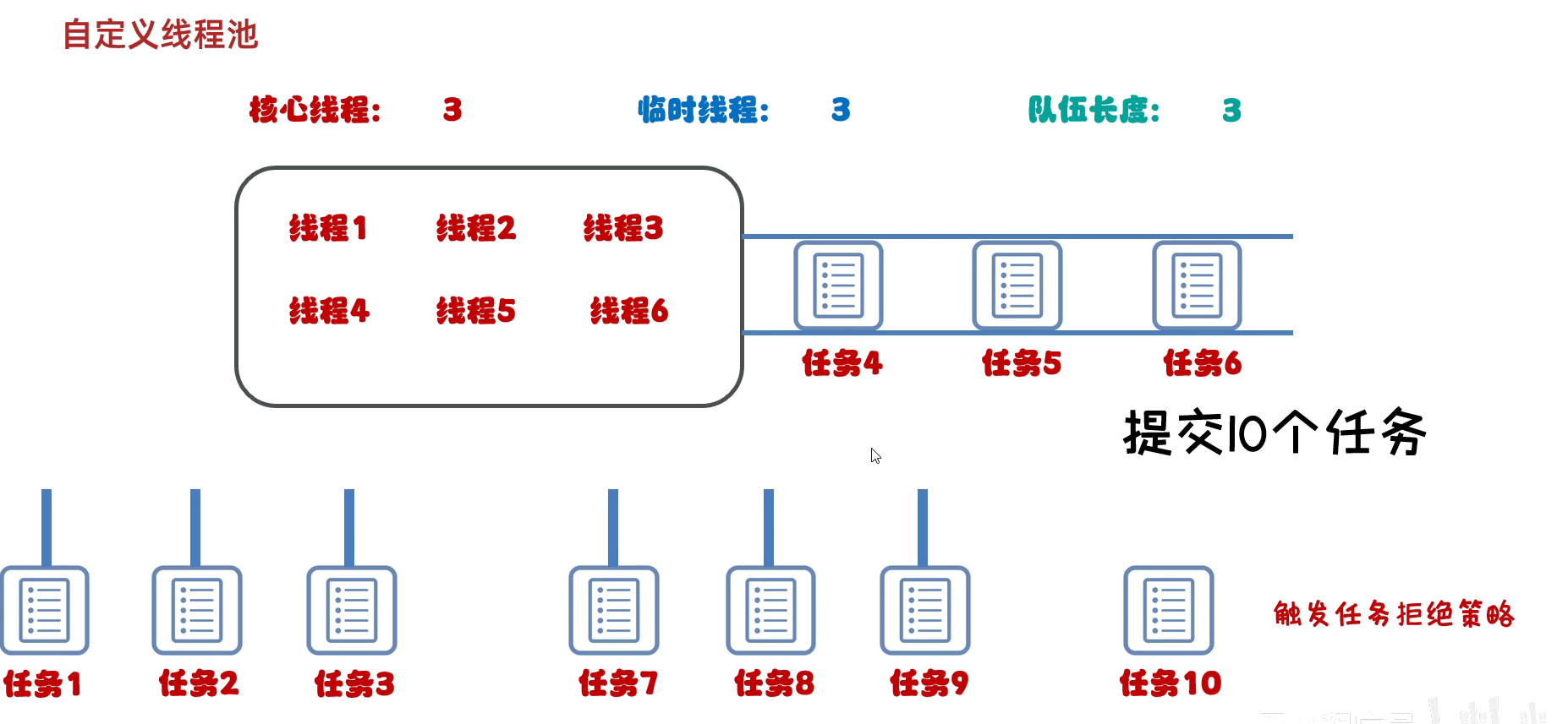 当核心线程全在处理任务,阻塞队列也排满了,临时线程也全部都在工作--线程池满负荷工作,那么再来其他任务,就会触发拒绝策略