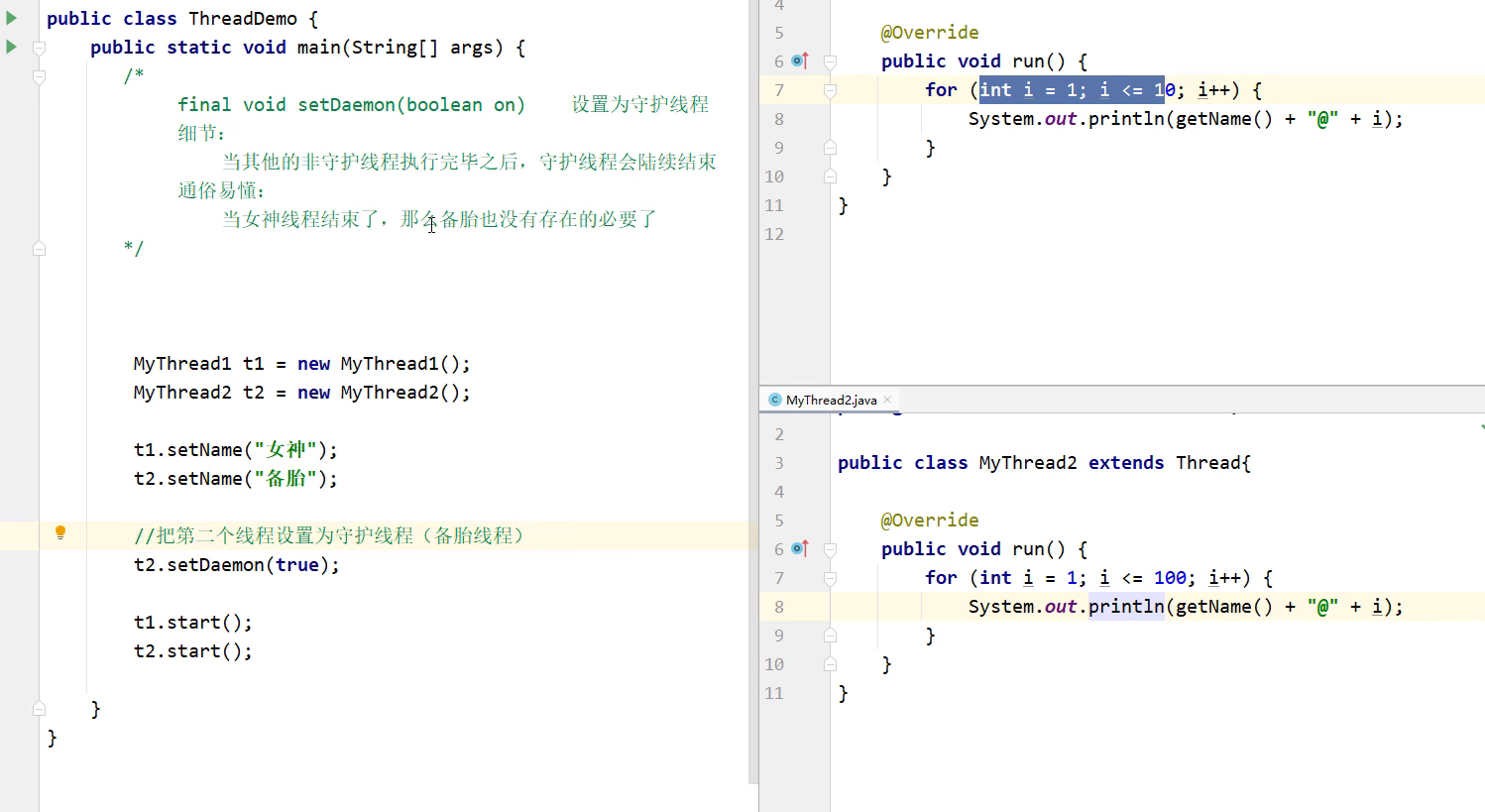 当非守护线程执行结束时,线程2也就没必要存在了,系统会告诉线程2,你也要结束了。此时不管线程2是否执行完毕,都会停止当前的进度。但是,并不是线程1一停止,线程2立马结束,系统告诉线程2 让线程2结束的这一段时间,线程2还会执行。