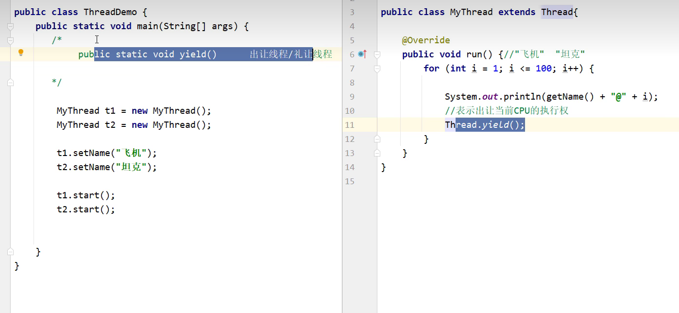 当执行到Thread.yield()时,该线程会把cpu控制权交出去,然后重新抢夺cpu。当然,这个线程也可能会再次抢到cpu。