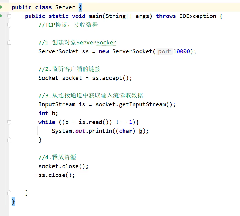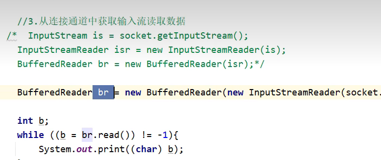 public class TcpTestReader {public static void main(String[] args) throws IOException {ServerSocket ss = new ServerSocket(65535);Socket socket = ss.accept();// 等待建立连接BufferedReader br = new BufferedReader(new InputStreamReader(socket.getInputStream()));int len;char[] c1 = new char[1024];while ((len = br.read(c1)) != -1){System.out.println(new String(c1,0,len));}br.close();socket.close();}