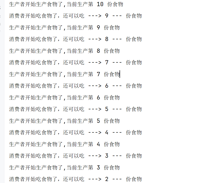 // 有食物Desk.consumerCount--;System.out.println("消费者开始吃食物了,还可以吃 ---> " + Desk.consumerCount + " --- 份食物");