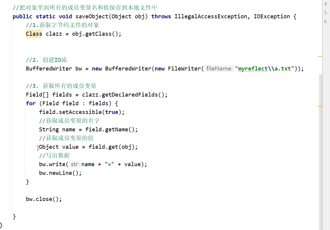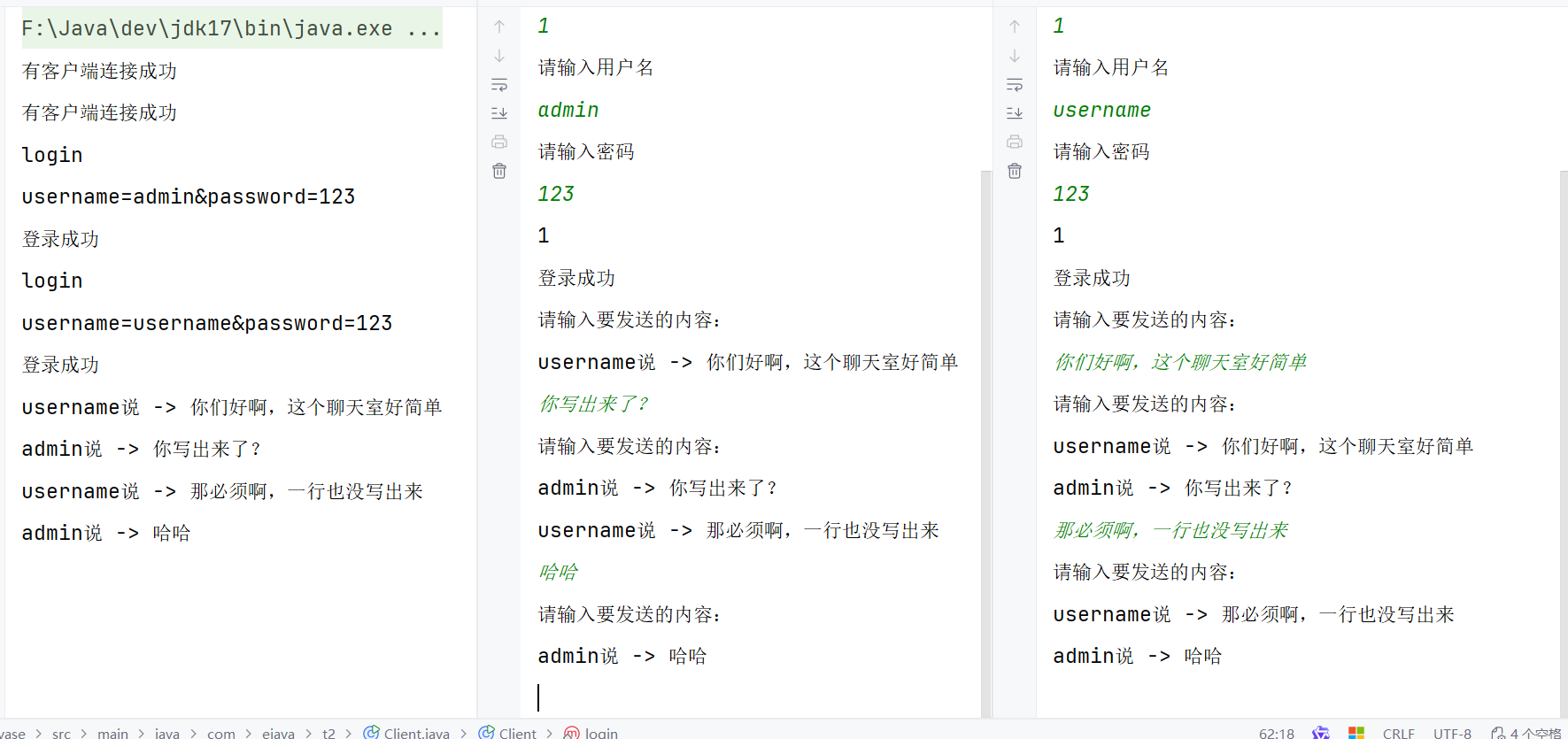 // 开始聊天getAndSendMsg2AllClient(usernameInput);} else {System.out.println("密码错误");sendMessage2Client("2");}} else {System.out.println("用户不存在");sendMessage2Client("3");}}private void getAndSendMsg2AllClient(String usernameInput) throws IOException {BufferedReader br = new BufferedReader(new InputStreamReader(socket.getInputStream()));while (true) {String msg = br.readLine();System.out.println(usernameInput + "说 -> " + msg);Server.list.forEach(s -> {try {sendMessage2Client(s, usernameInput + "说 -> " + msg);} catch (IOException e) {throw new RuntimeException(e);}});}}private void sendMessage2Client(String msg) throws IOException {/*这种写法需要手动拼接 \n 换行符号OutputStream outputStream = socket.getOutputStream();outputStream.write((msg + "\n").getBytes());outputStream.flush();*/BufferedWriter bw = new BufferedWriter(new OutputStreamWriter(socket.getOutputStream()));bw.write(msg);bw.newLine();bw.flush();}private void sendMessage2Client(Socket s, String msg) throws IOException {