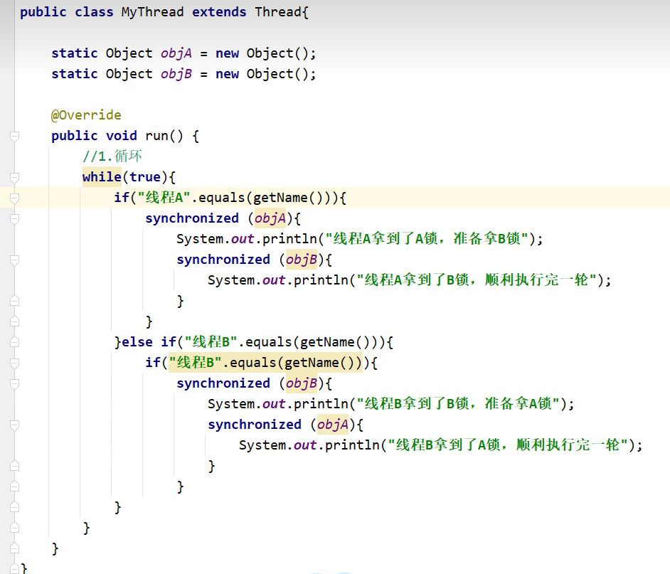 // 锁监视器使用在Desk中创建的锁对象,为了后续生产者和消费者等待或唤醒synchronized (Desk.lock){if (Desk.consumerCount == 0){break;}else {