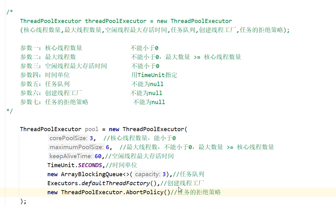 public static void main(String[] args) {ThreadPoolExecutor pools = new ThreadPoolExecutor(3,6,60,TimeUnit.SECONDS,new ArrayBlockingQueue<>(3),// new LinkedBlockingQueue<>()new ThreadPoolExecutor.AbortPolicy());}线程池参数设置问题: