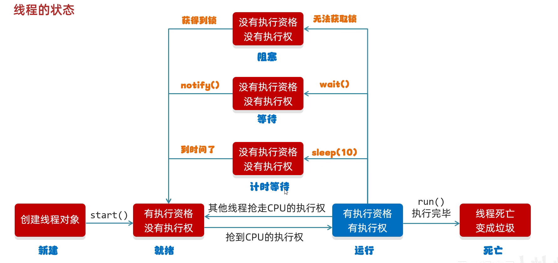 Java中没有定义运行这种状态,因为线程抢占到cpu后,程序就交给操作系统去处理了,jvm就不管了,所以,jdk没有定义运行状态,这里为了方便理解,写了运行状态。