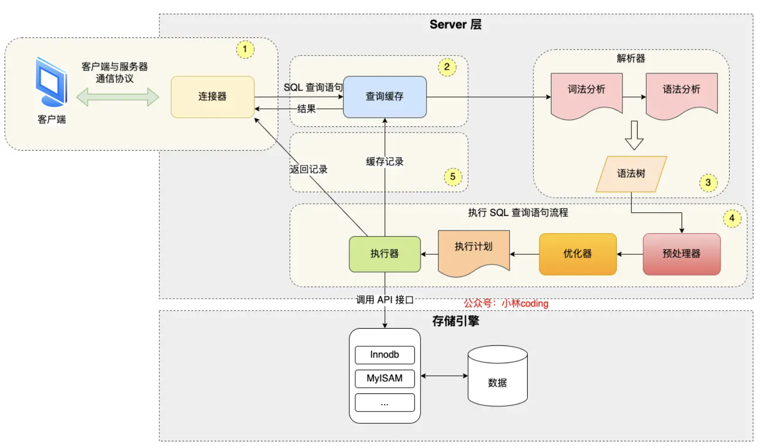 (1)Server层:主要负责建立连接、分析和执行sql语句。一般数据库的核心模块都在这里进行实现,包括连接器、查询缓存、解析器、预处理器、优化器和执行器。