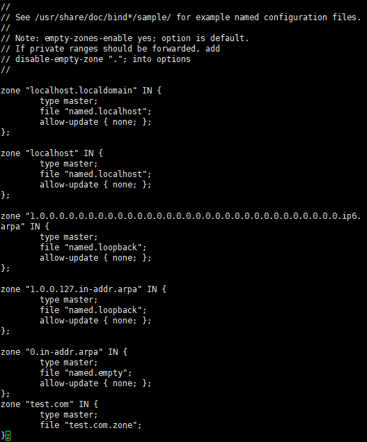 zone "test.com." IN {type master; # 该服务器是 test.com 的“主权威服务器”file "test.com.zone"; # 区域数据文件路径(/var/named/ 下)