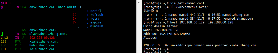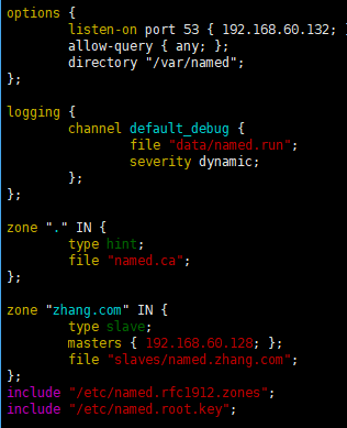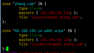 zone "zhang.com" IN {type slave;masters { 192.168.60.128; };file "slaves/named.zhang.com";