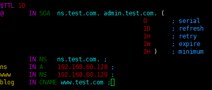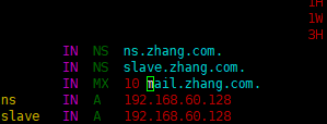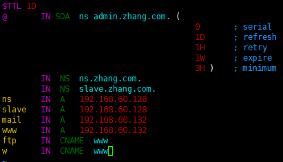@ IN SOA ns admin.zhang.com. (0 ; serial1D ; refresh1H ; retry1W ; expire3H ) ; minimumIN NS ns.zhang.com.IN NS slave.zhang.com.