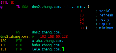 @ IN SOA dns2.zhang.com. haha.admin. (0 ; serial1D ; refresh1H ; retry1W ; expire3H ) ; minimumNS dns2.zhang.com.
